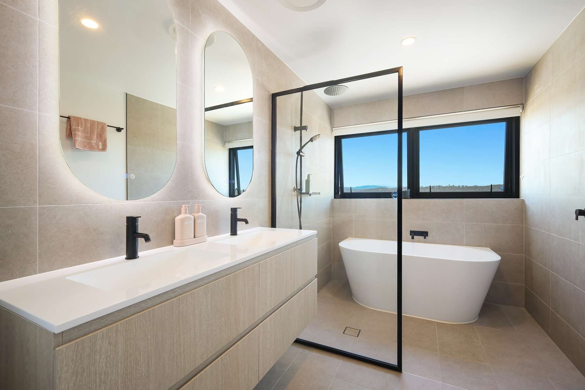 Meanwhile, the chic master retreat boasts hinterland scenery, thanks to floor-to-ceiling windows. A walk-through robe flows to a sophisticated ensuite with a walk-in shower, freestanding bath, and double vanities. Nearby, you'll find two further, spacious bedrooms, both with built-in robes, and sharing an attractive contemporary bathroom.
