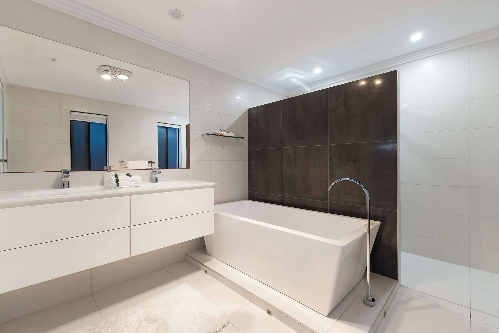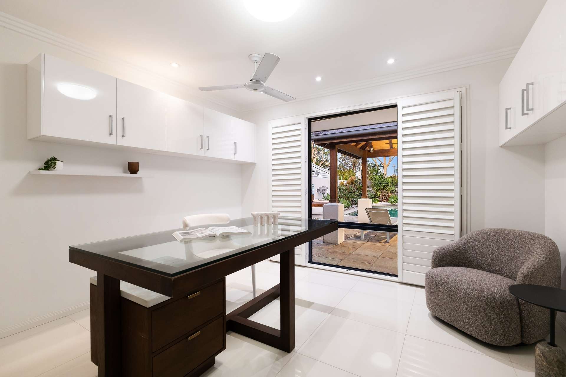 The oversized master suite also opens to the waterfront deck, accompanied by a walk-in robe and ensuite with a luxe freestanding bath to soak away the day. Three additional bedrooms with built-in robes are serviced by a main bathroom adorned with floor-to-ceiling tiling and thanks to an executive office with custom cabinetry, you can work productively from home.