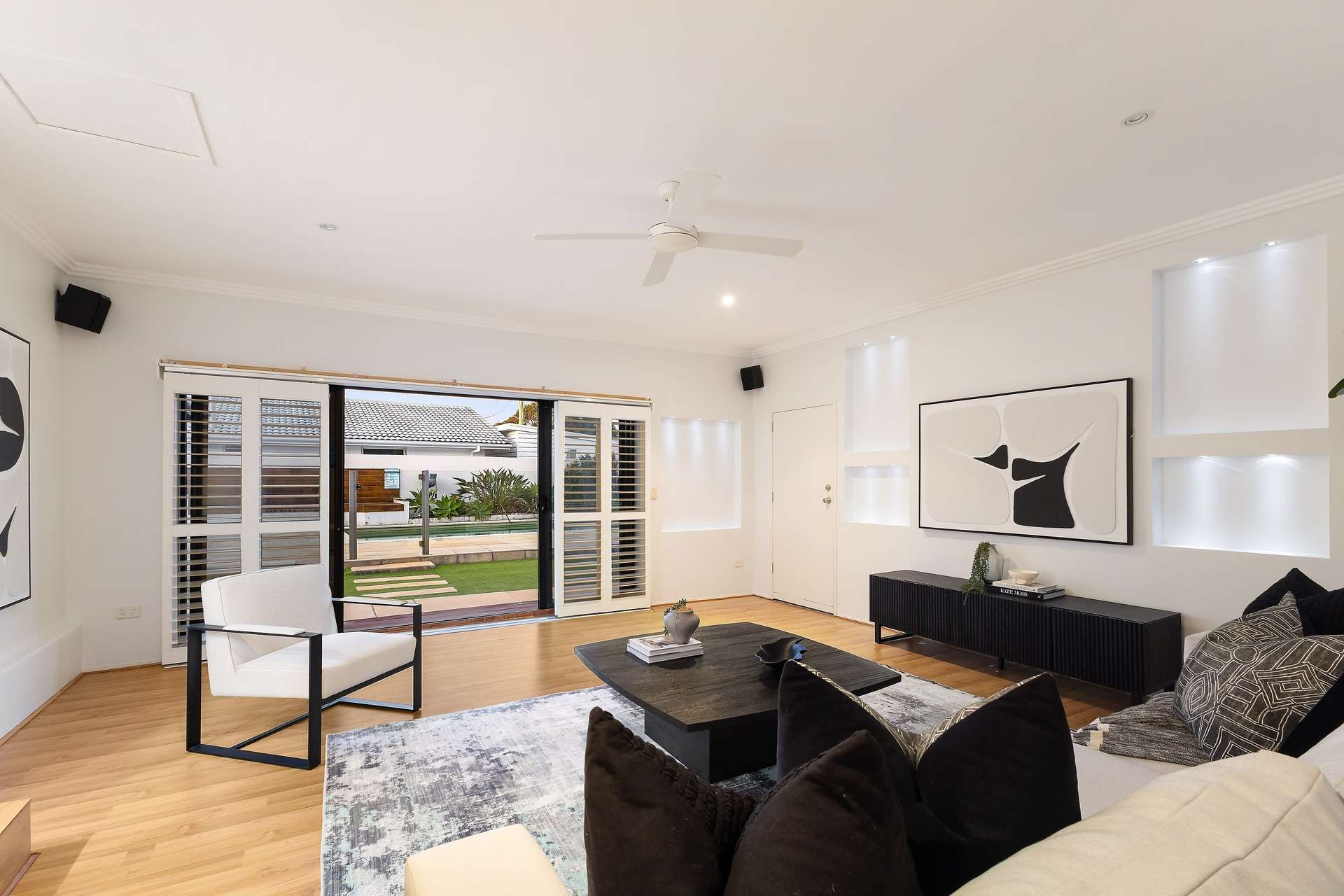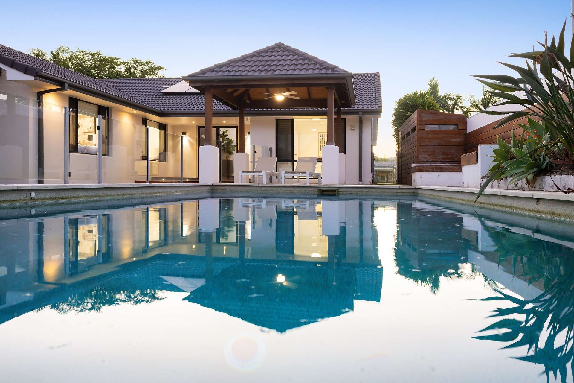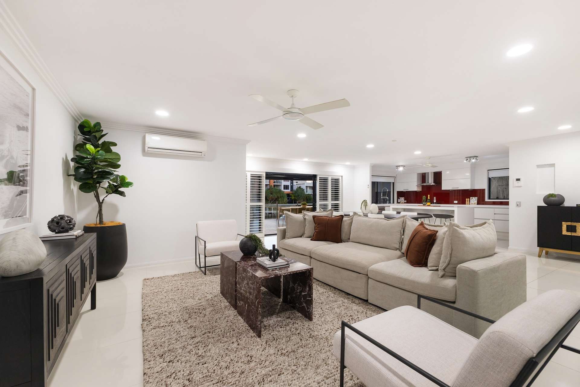 Designed for single level comfort, connection and convenience, this waterfront home promises stylish serenity moments from Main River. Perched on a 754m2 block in a blue-chip location, opposite Lex Bell Park and approx. 1.5km from golden beaches, it's beautifully presented and light-filled, with plantation shutters throughout adding a modern touch. Large format porcelain tiles gleam underfoot in the spacious living and dining zone, complemented by a media room with surround sound for home movie nights and a contemporary kitchen. Offset by sleek engineered stone benches, a bold splashback, and a servery window, it offers effortless connection to indoor and outdoor entertaining and relaxation zones.