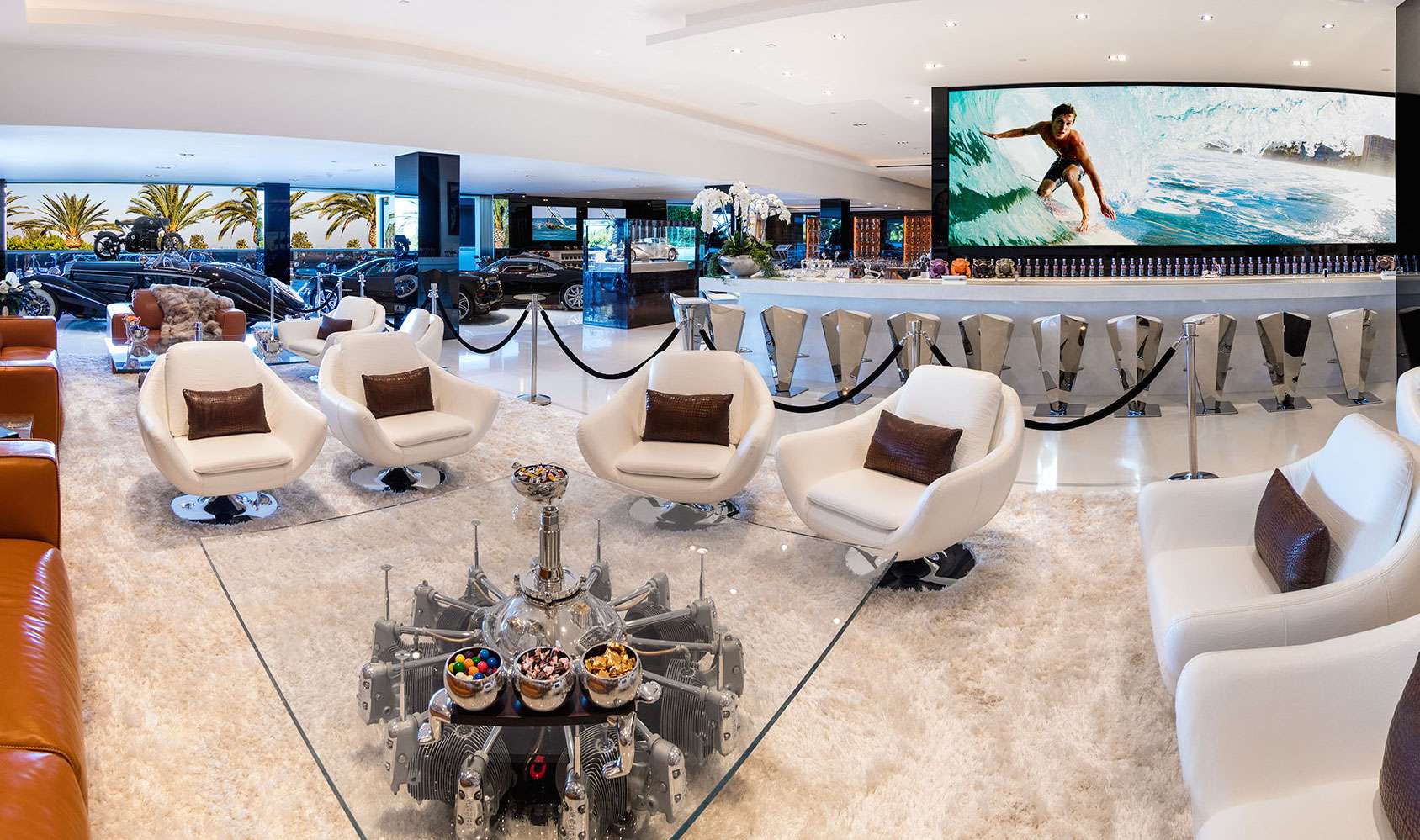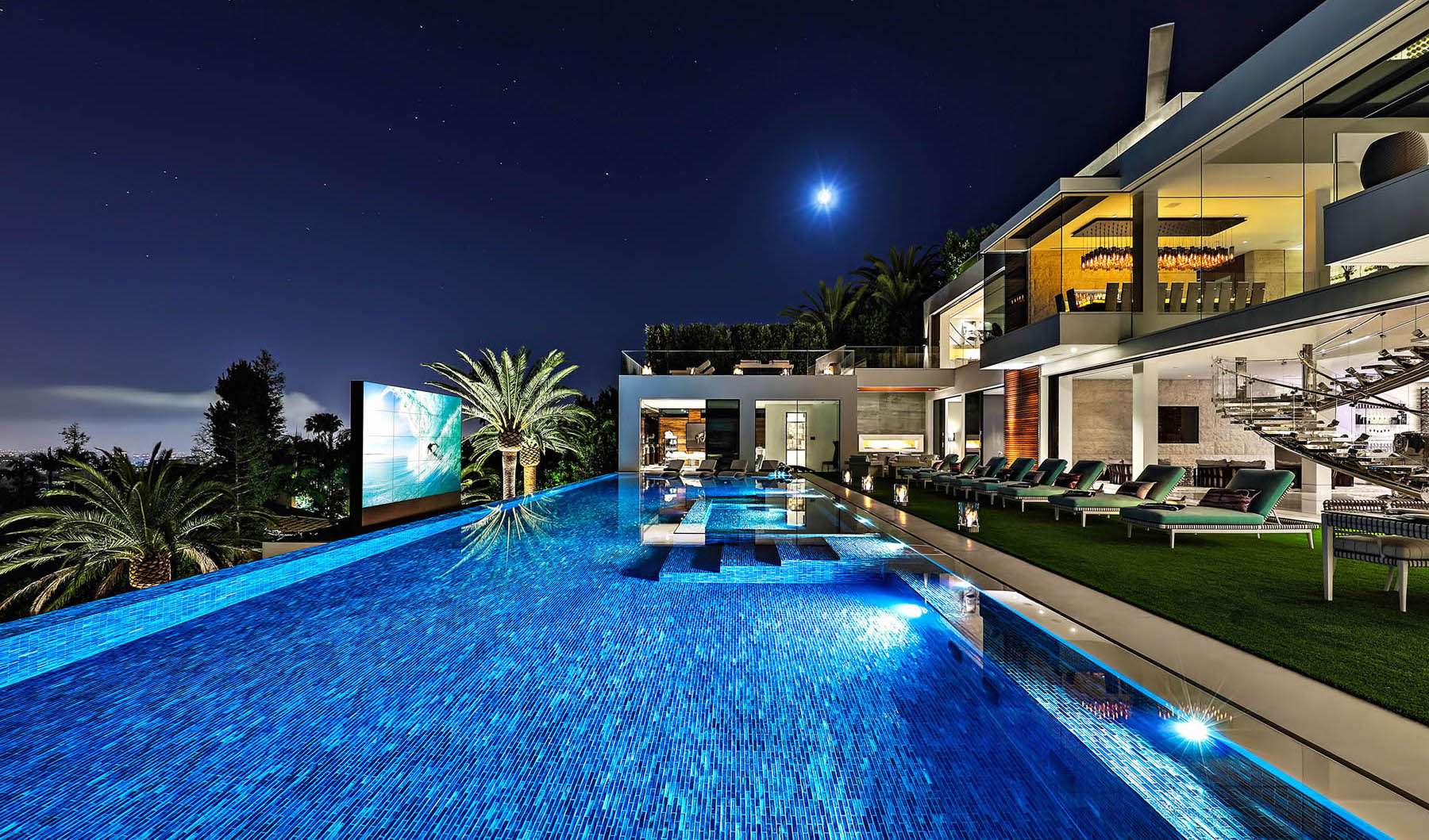 17,000 sq ft of entertainment decks, 2 master suites, 10 over-sized VIP guest suites, 21 luxurious bathrooms, 3 gourmet kitchens, 5 bars, massage studio/wellness spa, state-of-the-art fitness center, 85-foot glass tile infinity swimming pool, 40-seat 4K Dolby Atmos Theater, 4 lane bowling alley/lounge, auto gallery w/cars worth more than $30mm, 7-person full time staff, over 100 curated art installations, outdoor pop-up theater, 2 fully-stocked champagne/wine cellars, massive candy wall, the most advanced home tech system in the world.